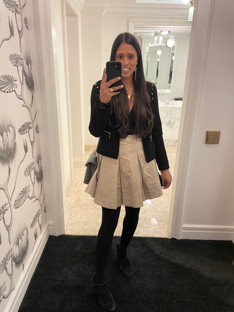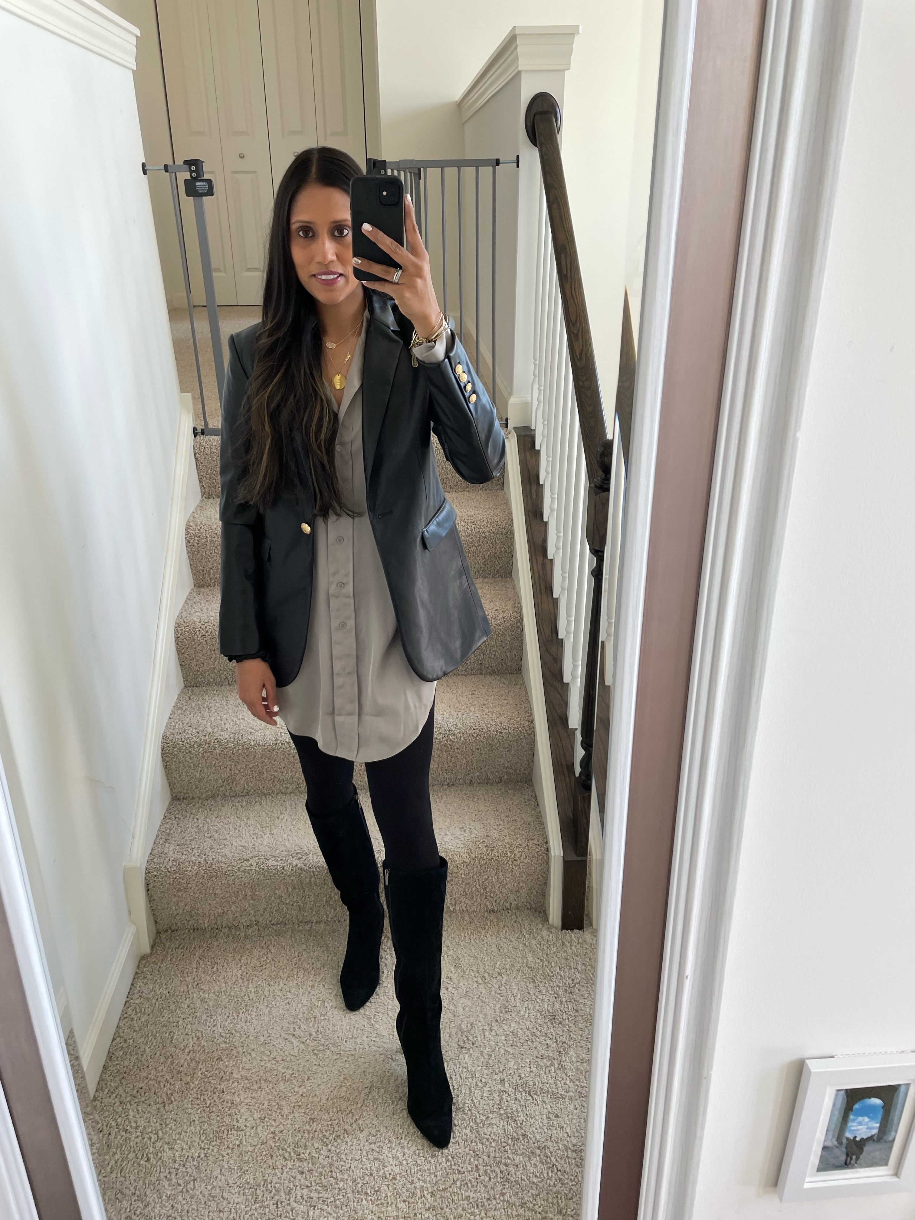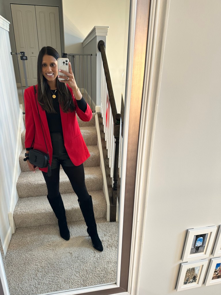 For the winter, I wear my darker colored blazers and add tights and boots to be comfortable for the climate and usually pair with these faux leather Shorts that compliment literally everyone, the softest faux leather ever!