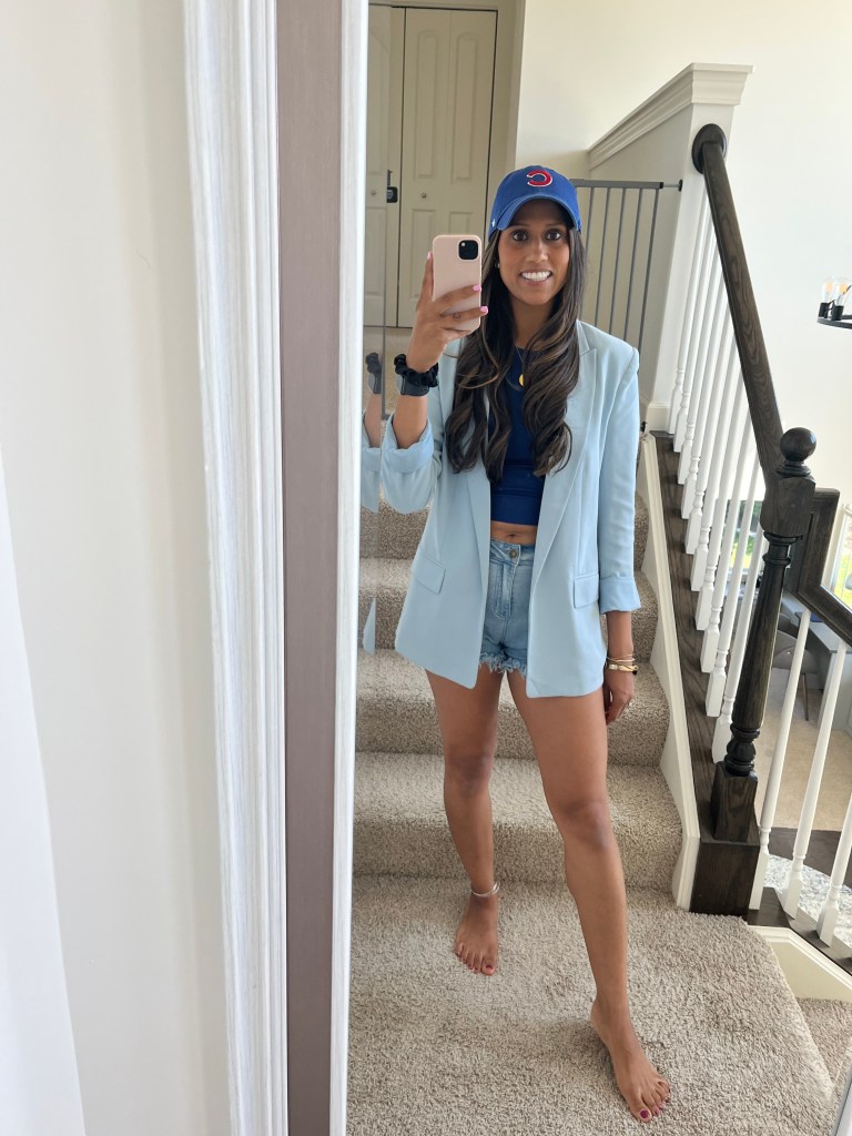 I wear shorts in the Summer and add my favorite crop top from Amazon, more on my favorite Amazon purchases in my next post – I have it in 4 colors, best cut and fit and add a blazer on top.