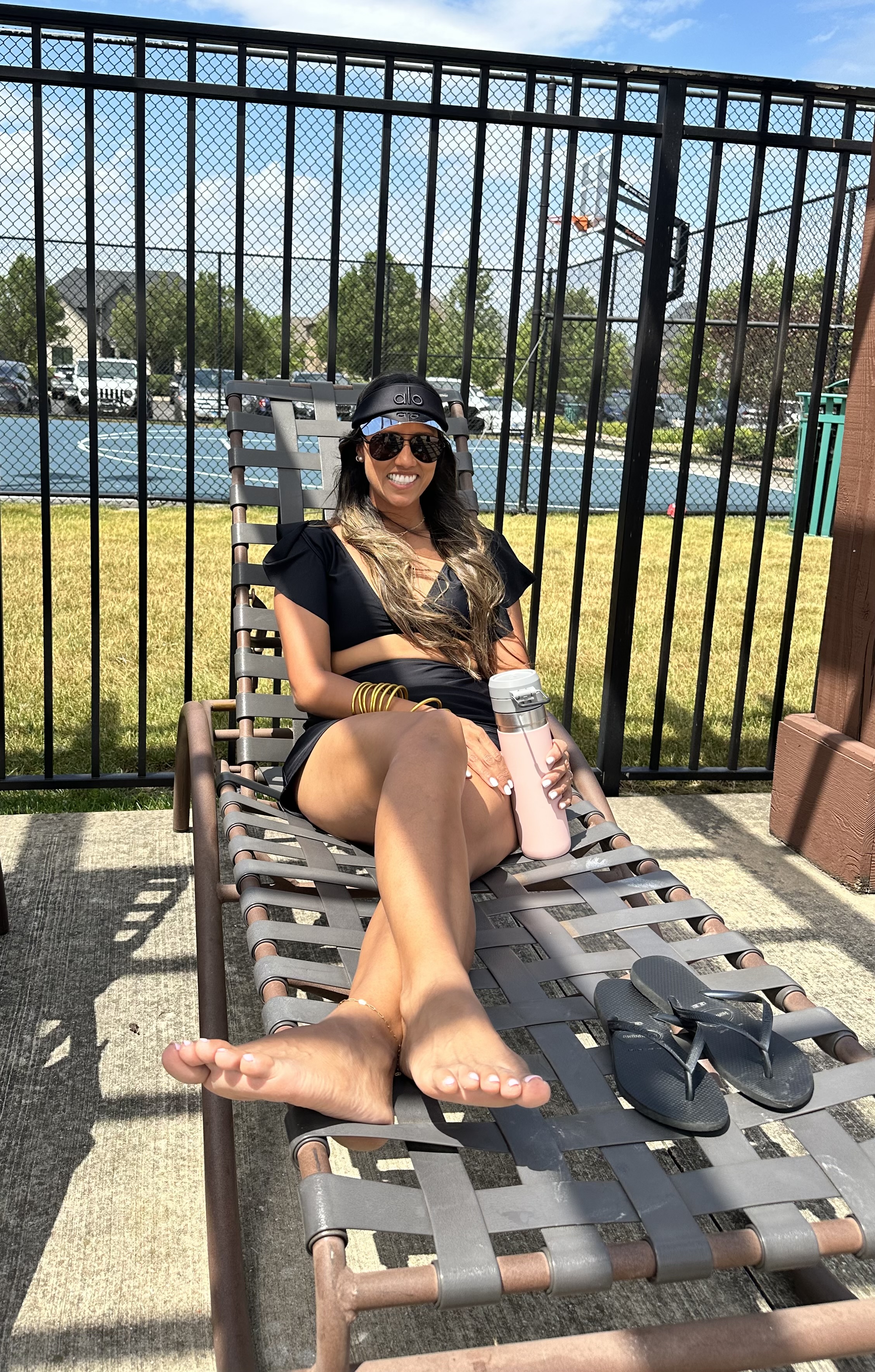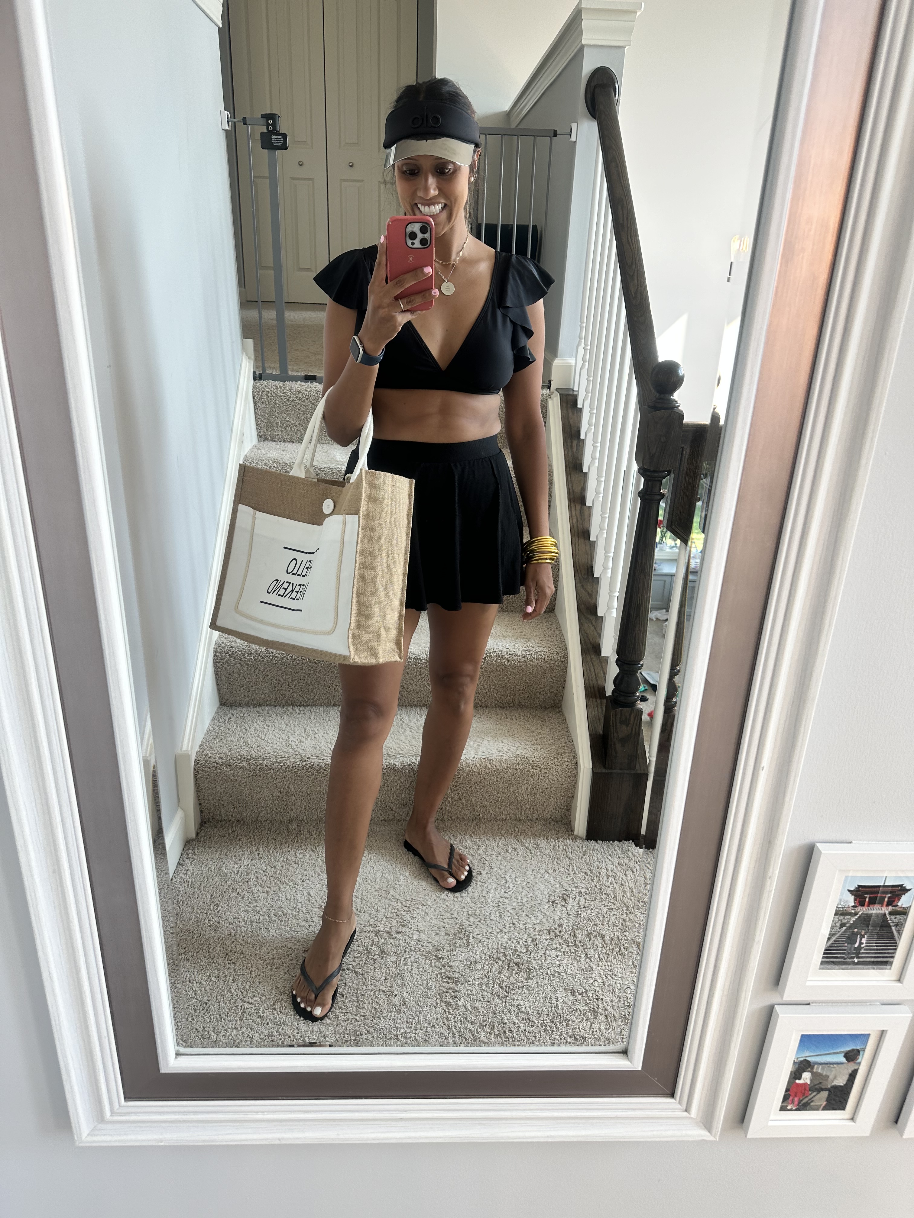I buy these as a set but only wear the tops, I love the ruffle look in addition to the fact that it cover my shoulders. It truly helps keep those sun burns at bay and has the perfect cut for those of us with ittie bitties. It is also perfect when you are with your kids because it doesn’t move and stays even they are grabbing you for attention or is that just my kids?! ha I add these bottoms from Amazon as well!