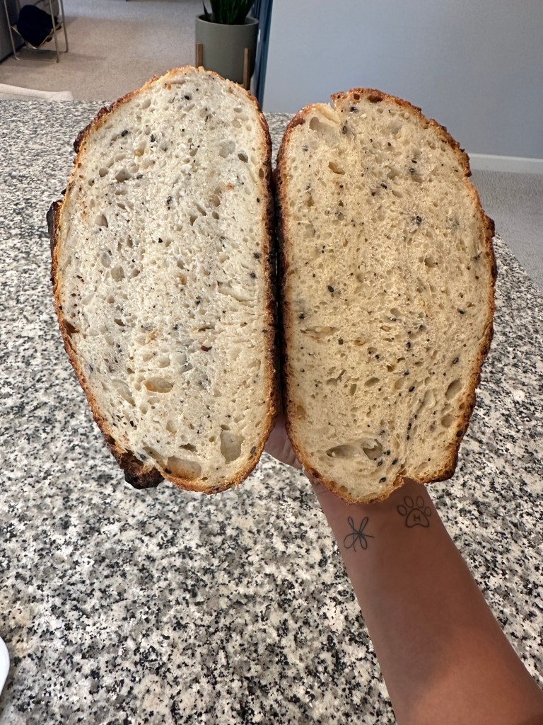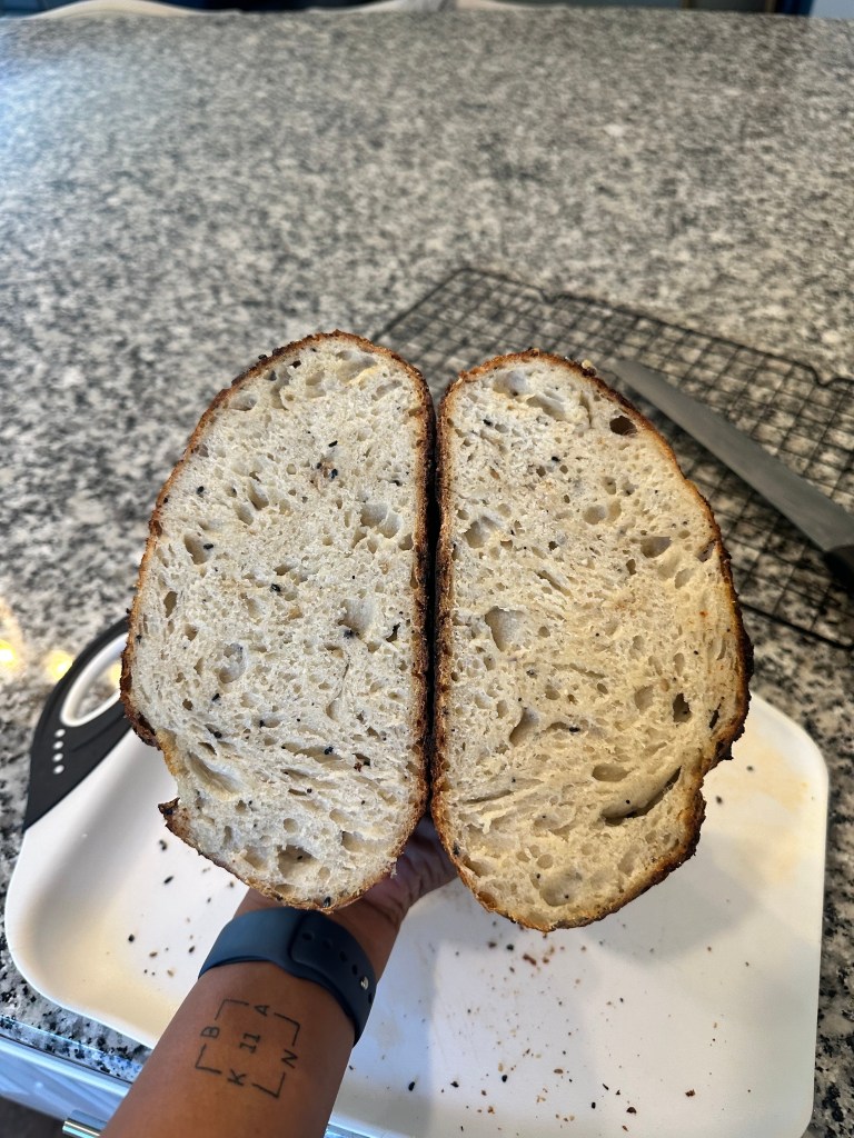 I was lucky enough to find RunlikeKale on IG a mama who is the one who initially inspired me to make Sourdough and even mailed me a dry starter to get started. Ever since her, I have been dedicated and constantly use her bagel recipe and it never disappoints. She also sent me this bread recipe and it is FOOL proof. I have been using this every time and it’s so simple yet effective, makes a perfect loaf every time.